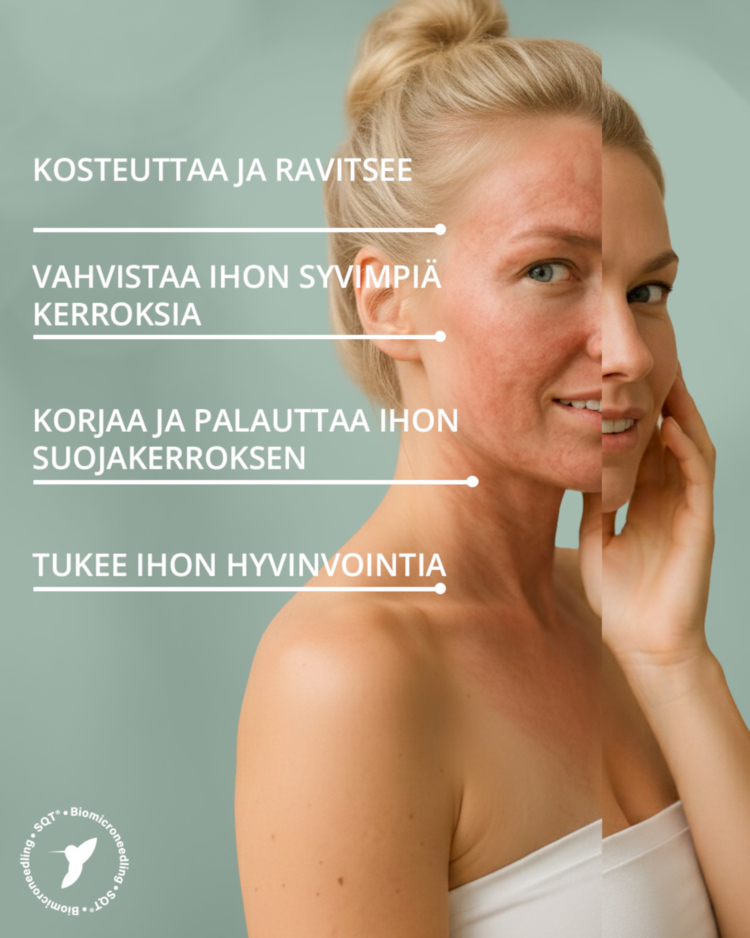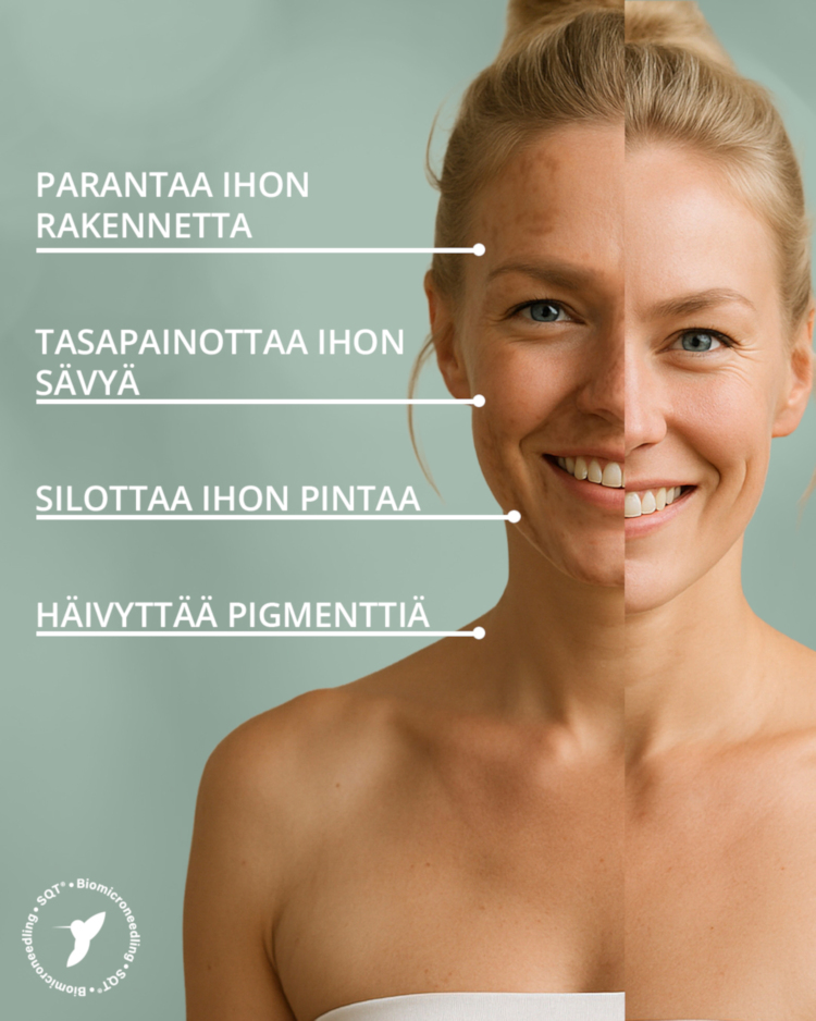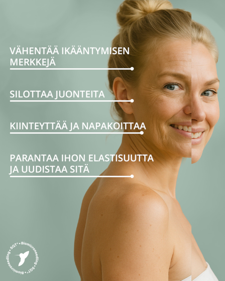 SQT-biomikroneulaus on edistyksellinen, luonnollinen ja tehokas ihon uudistushoito, joka hyödyntää makeanveden sienestä saatuja mikroskooppisia neuloja. Piipitoiset neulaset aktivoivat ihon oman luonnollisen korjautumisprossin, nopeuttaa mikroverenkiertoa, stimuloi kollageenin ja elastaanin tuotantoa sekä uudistaa ihoa tehokkaasti. Hoito kiinteyttää, kirkastaa sekä nuorentaa ihoa, ja sopii usein myös herkälle iholle.